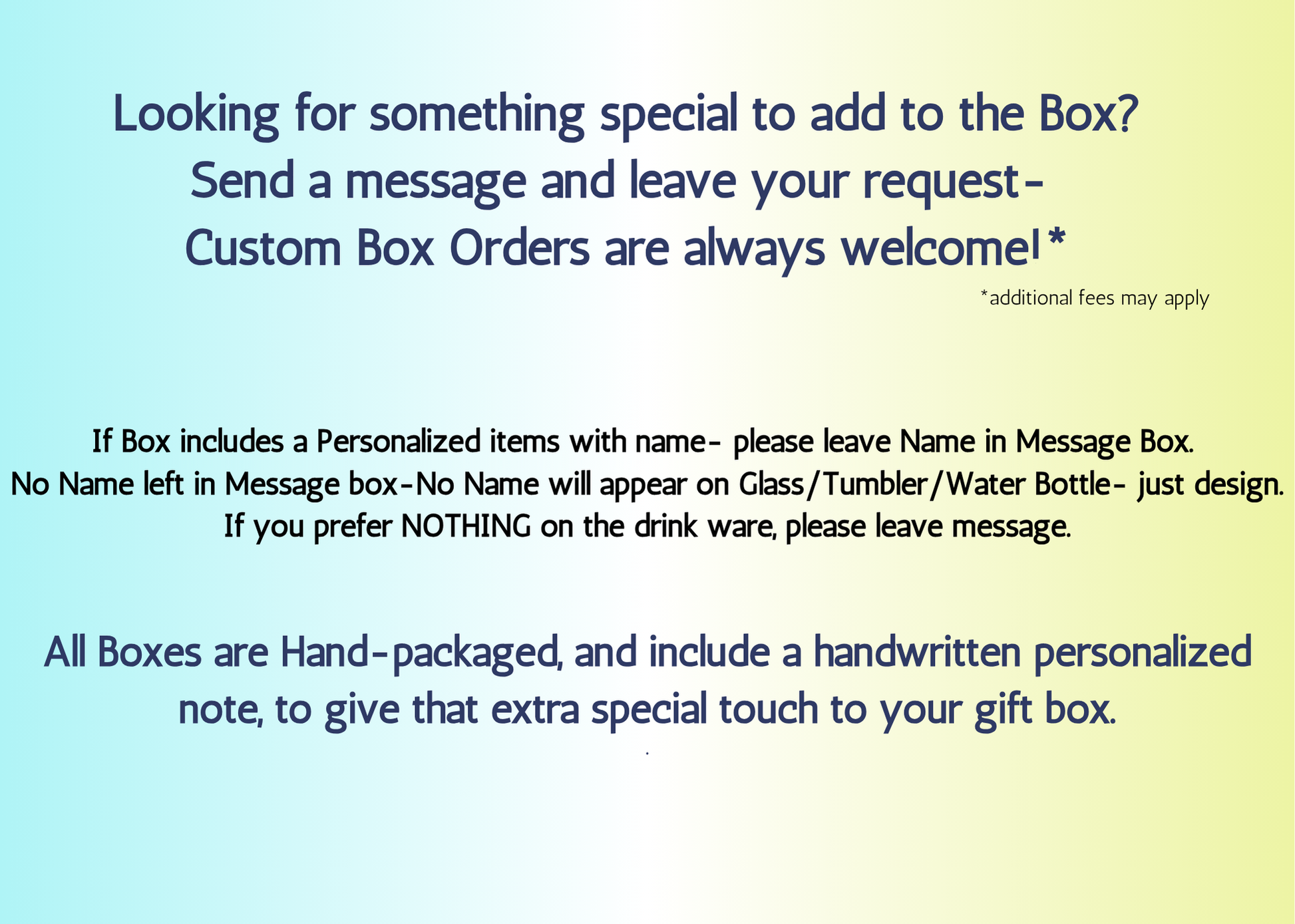 All Boxes will include a personalized note card with message from the buyer(if not received prior to shipping, then no message will appear on card)