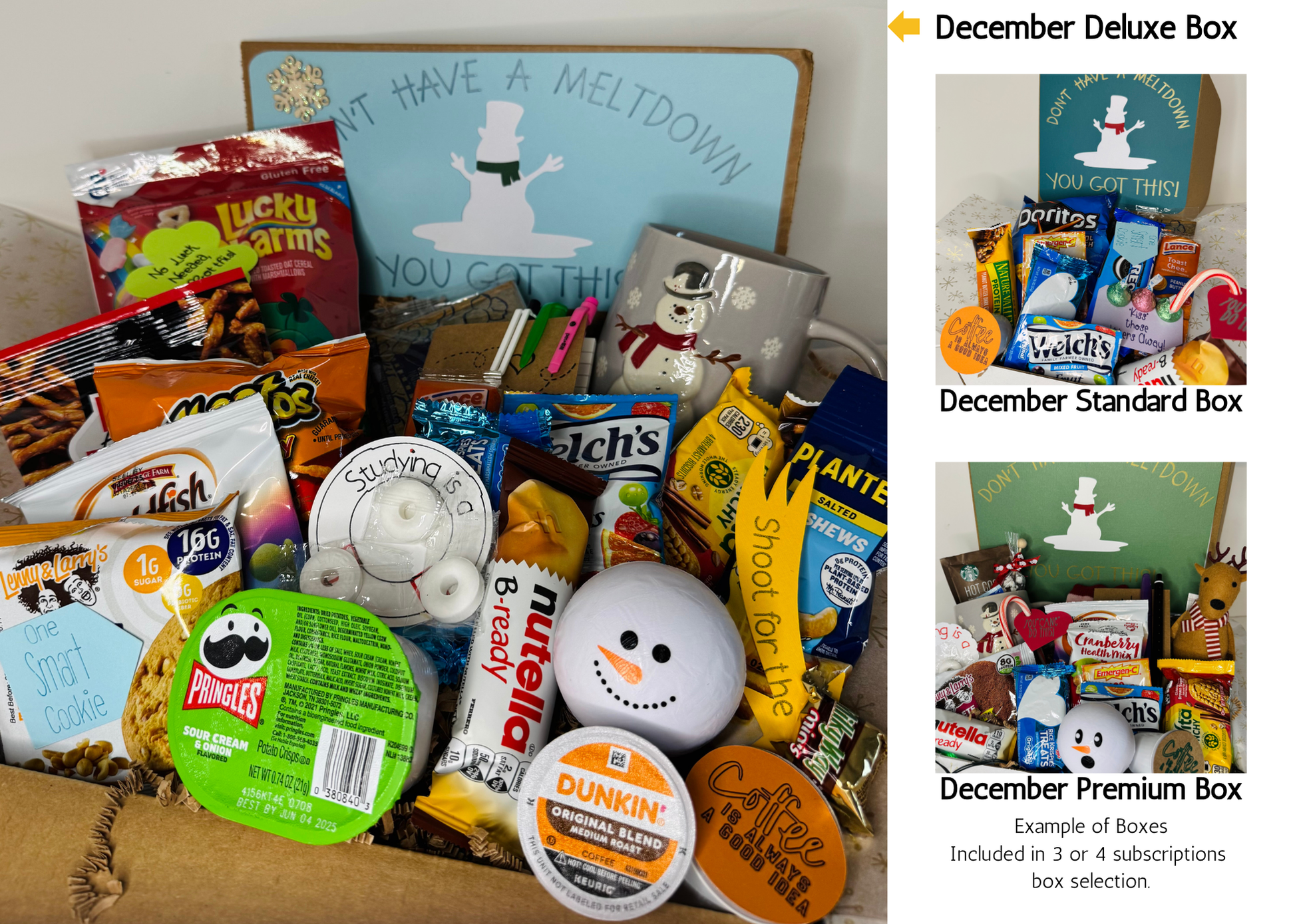 Depending on subscription selection- a care package will be sent to your student monthly. Each Box has a theme: