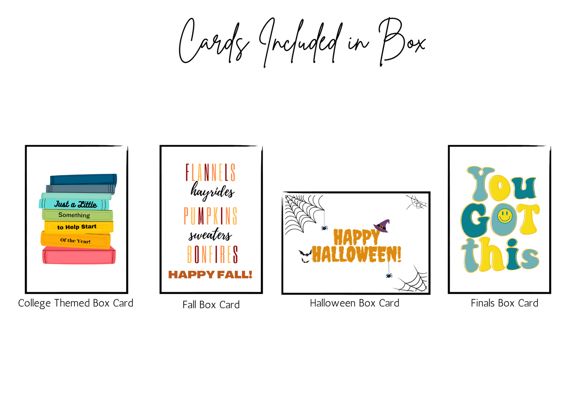 Subscription Box Plan includes 2, 3 or 4 care packages sent to your loved one. One each month(depending on option selected) starting in August 2025 and ending in the first week of December 2025(unless requested earlier due to finals).