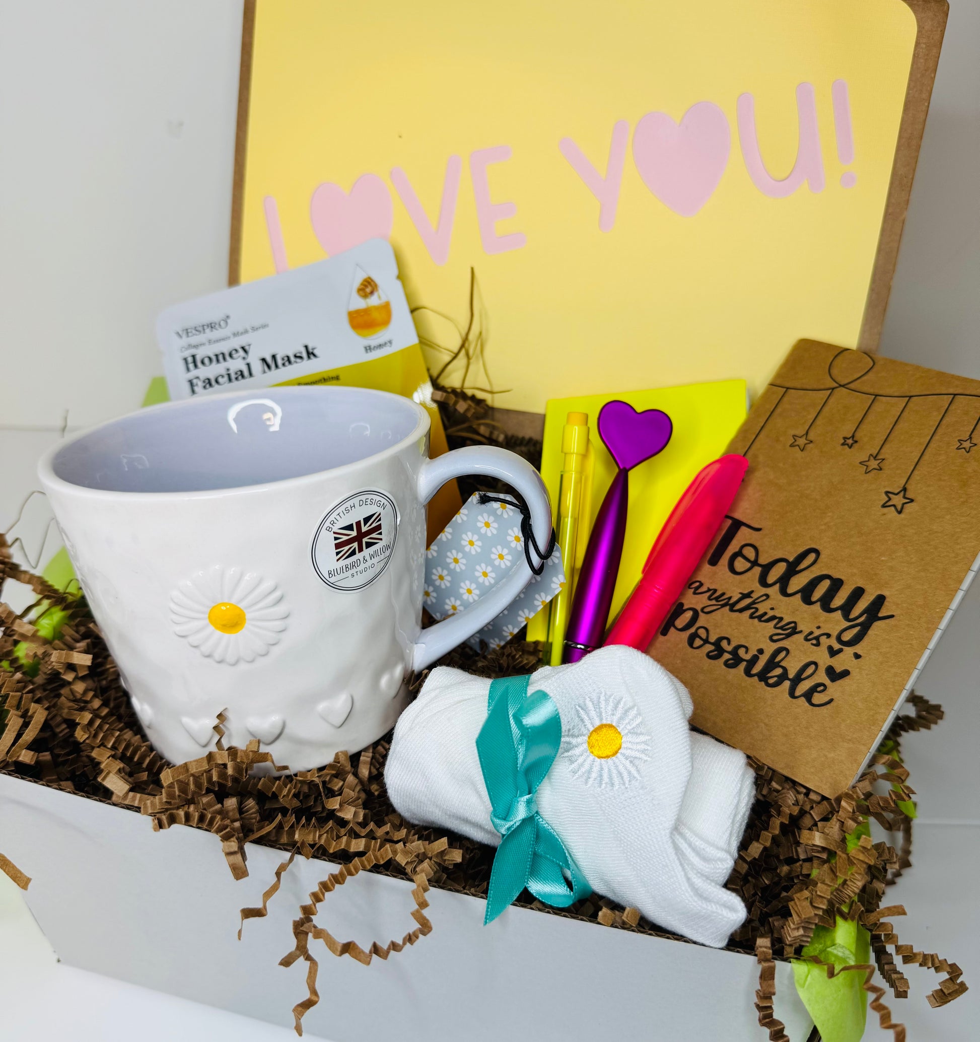 Send some smiles in a care package to your special someone. So many great items packed in this care package. Beautiful mug made in England, Chapstick and a Facial Mask are a great touch to pamper oneself, and a small notebook, pens, and sticky notepad- a few helpful study tools. Cozy ankle socks and a fun decorative sticker included as well.
