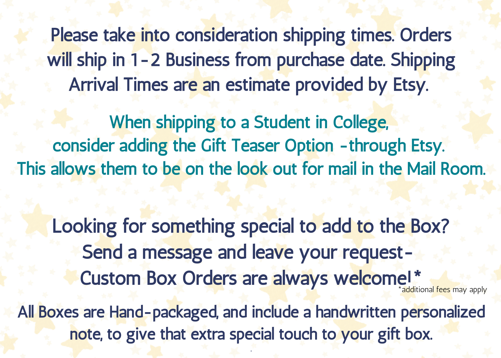 *Snack items may contain nuts and other allergy related ingredients. The customer & consumer is responsible for reading the item's nutrition labels and ingredient lists prior to consuming the food items in our packages. Happy College Box and all its' owners & employees are not responsible or liable for adverse reactions after consuming or receiving food included in this listing.